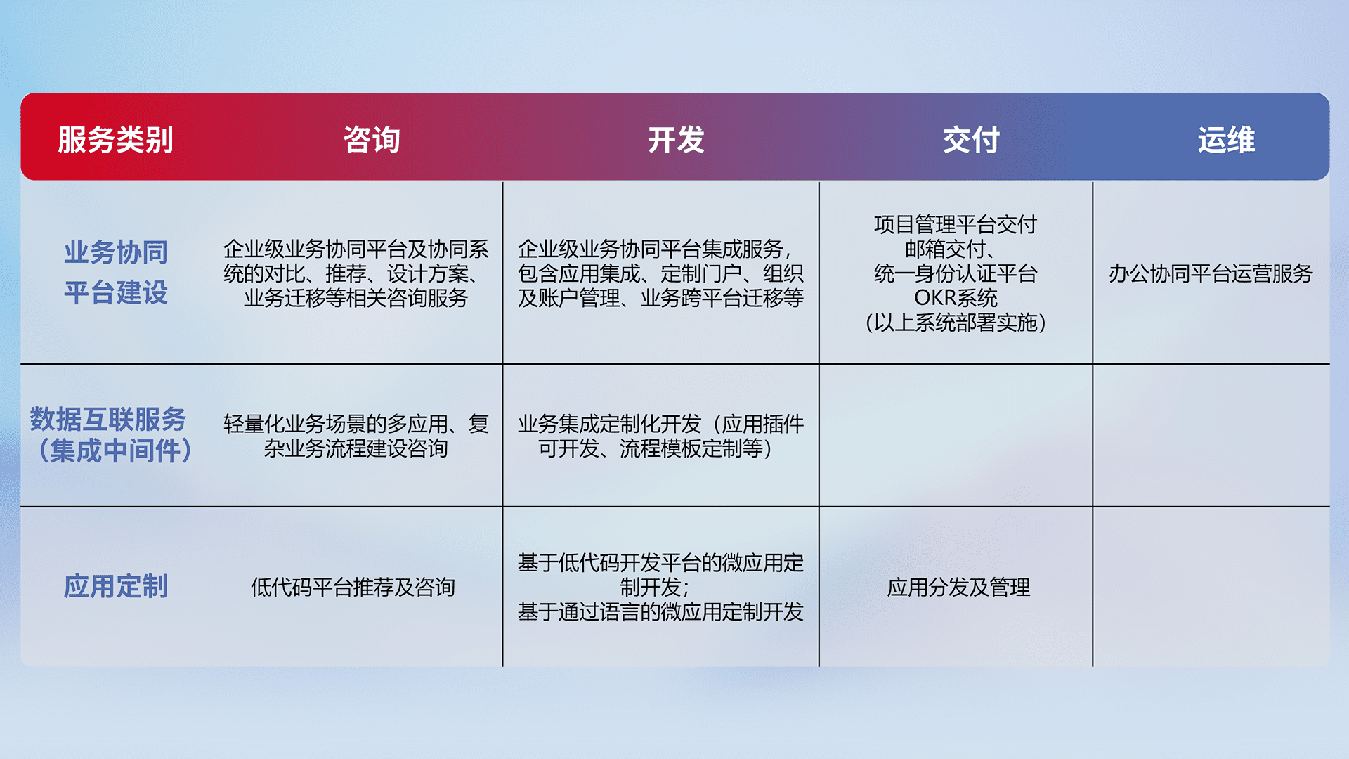针对钉钉、、、、企微、、、IDaas等平台级产品提供产品的规划、、、、方案、、、交付、、定制化开发等服务,,,实现如统一协同办公、、智能客户服务、、、混合会议管理、、、、智能数据查询、、、、等业务场景,,实现数字化转型。。
