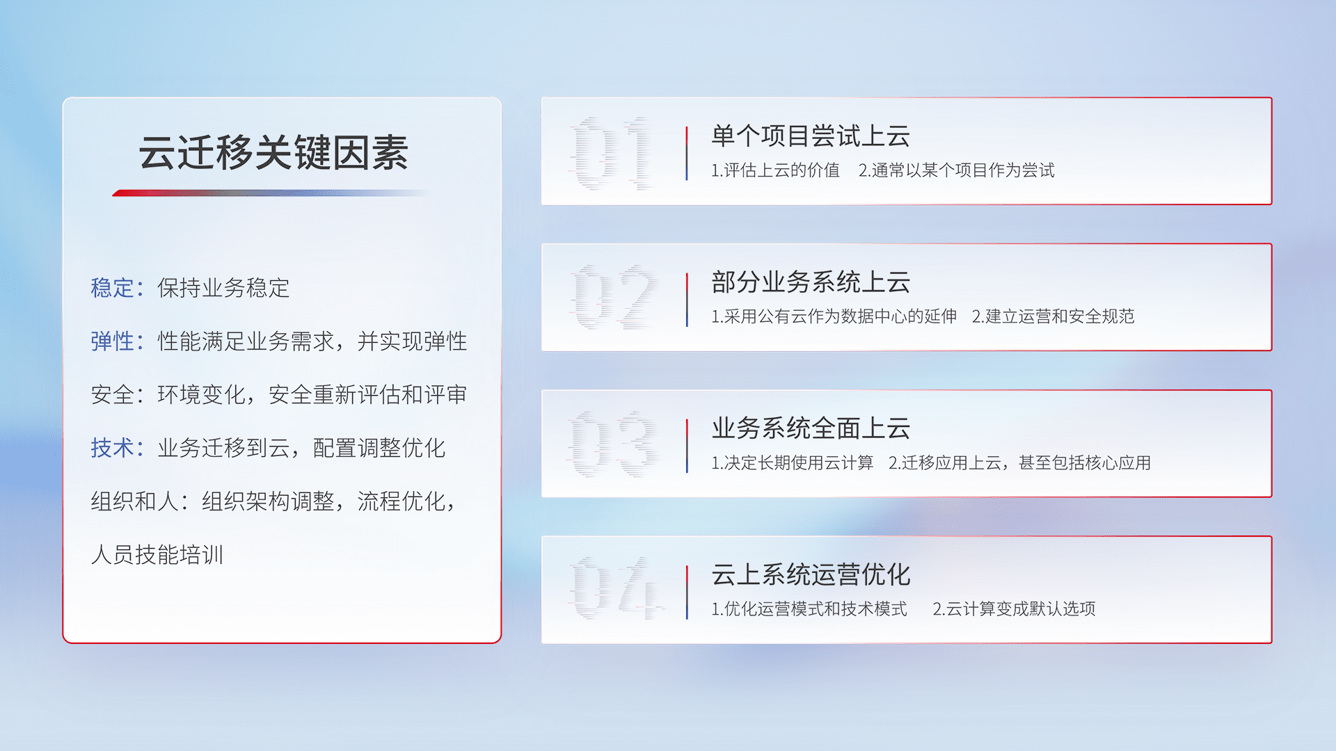 结合实际业务,,,,从规划设计、、云平台选型、、、云原生改造、、、数据迁移、、、集成交付,,,迁移全过程为客户识别最佳上云路径,,,,做好风险识别管理,,,,设计网络架构、、、身份权限、、、安全审计合规、、、操作审计、、、、日志审计、、、、监控告警策略、、、多站点容灾设计等,,,对云上基础设施进行整体规划,,,,提升IT治理水平,,,以满足弹性、、、高可用、、、高性能的需求。。。。